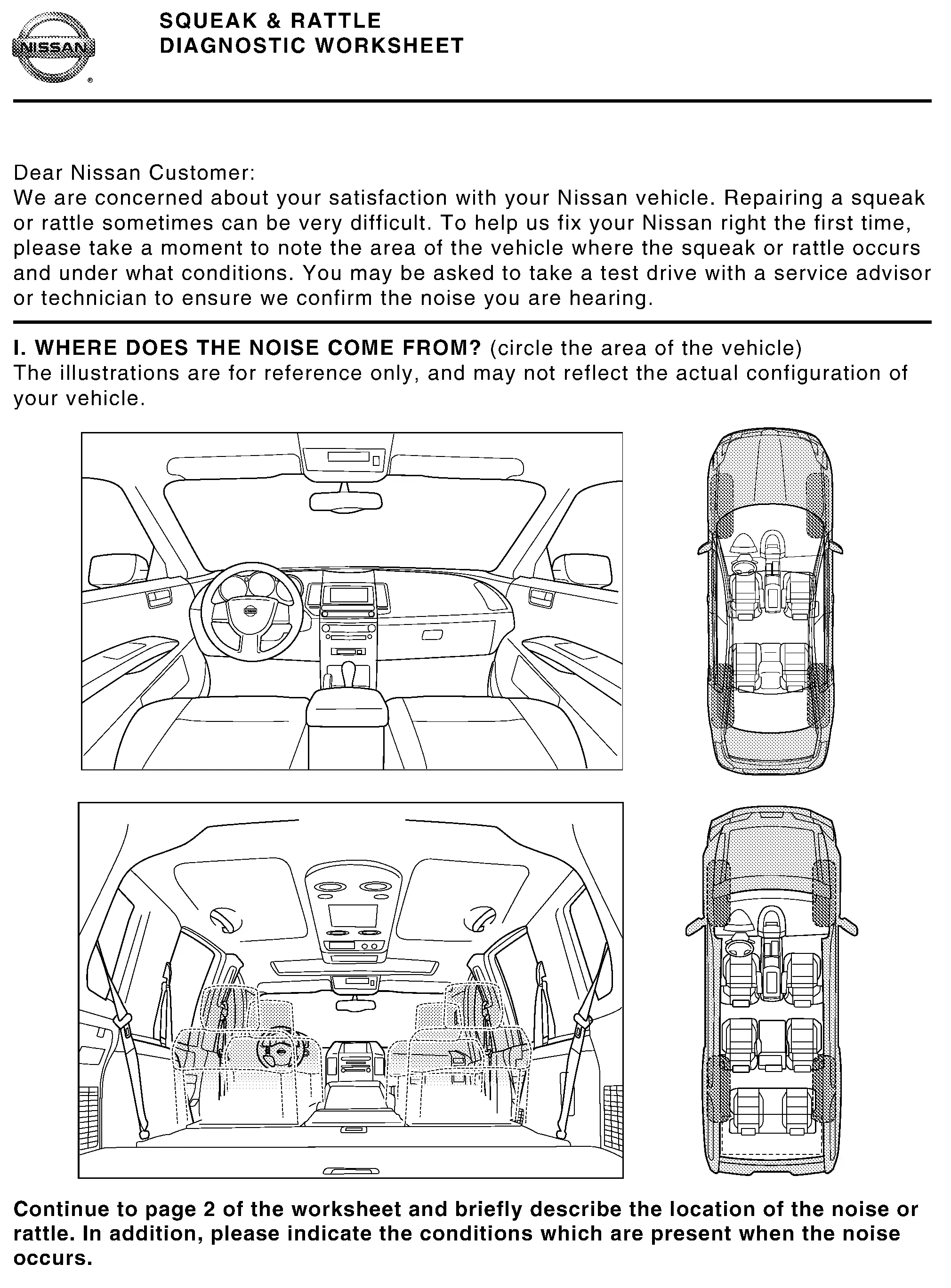 If it is difficult to duplicate the noise, drive the Nissan Ariya vehicle slowly on an undulating or rough road to stress the vehicle body.