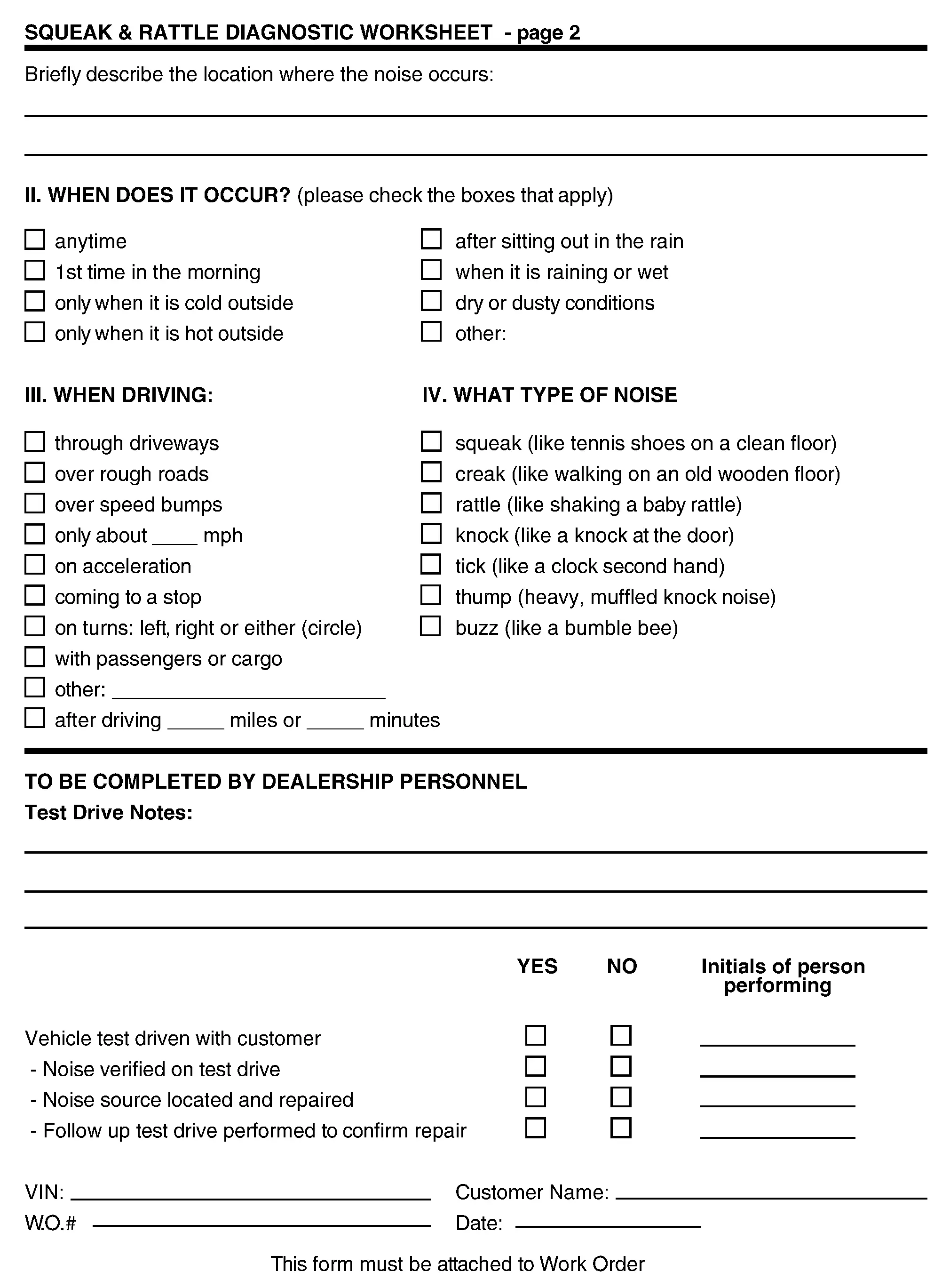 The customer may not be able to provide a detailed description or the location of the noise. Attempt to obtain all the facts and conditions that exist when the noise occurs (or does not occur).