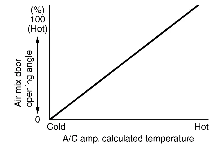 A/C amp. calculates the target air mix door opening angle depending on set temperature, in-Nissan Ariya vehicle temperature, ambient temperature, sunload and engine coolant temperature.