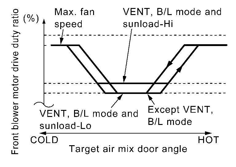 When mode door motor is activated while air flow is more than the specified value, A/C amp. reduces temporarily fan speed so that mode door moves smoothly.