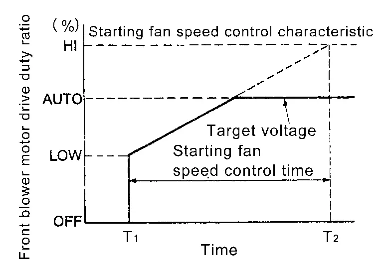 When the voice control (voice command) switch is operated during air flow automatic control, A/C amp. decreases the air flow of the front blower motor once and controls the air flow so as not to disturb the voice recognition function. This control continues while voice recognition function is operating.