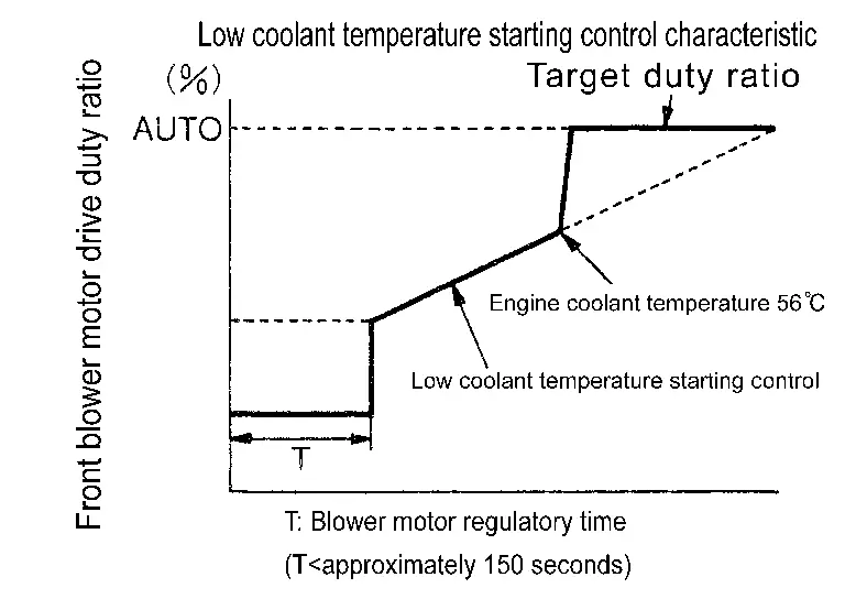 When evaporator temperature is high [intake sensor value is 35°C (95°F) or more], to prevent a hot discharged air flow, A/C amp. suspends front blower motor activation for approximately 3 seconds so that evaporator is cooled by refrigerant.