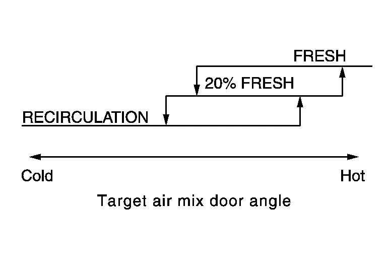 While air inlet is in automatic control, A/C amp. selects air inlet (fresh air intake, 20% fresh air intake, or recirculation) depending on set temperature, in-Nissan Ariya vehicle temperature, and ambient temperature.