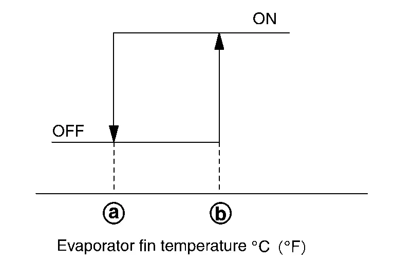[−5.0°C (23.0°F)] or less, A/C amp. requests ECM to turn the A/C compressor OFF, and stops the A/C compressor.