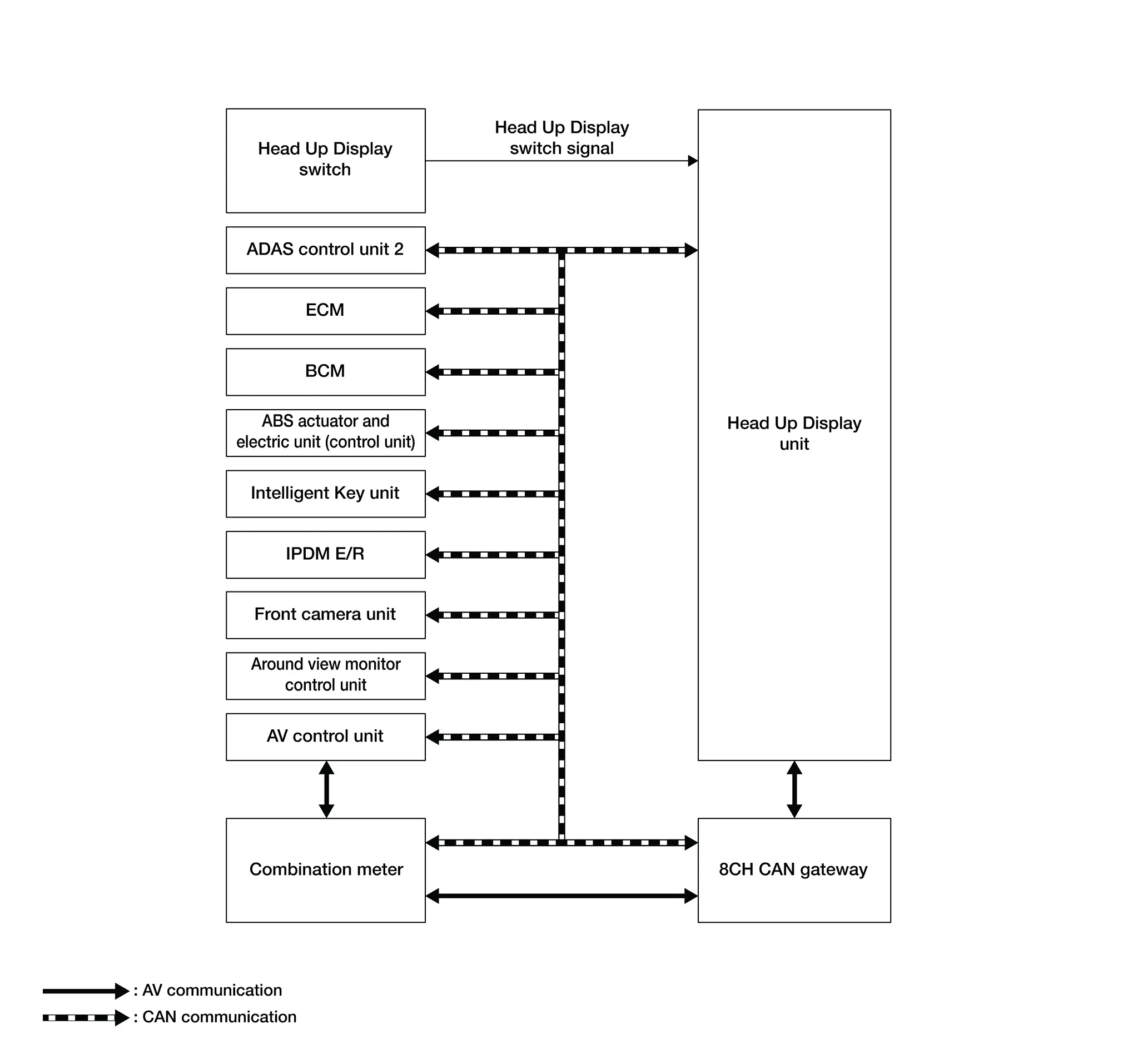 The Head Up Display unit receives necessary signals from each ECU via CAN communication and local communication.