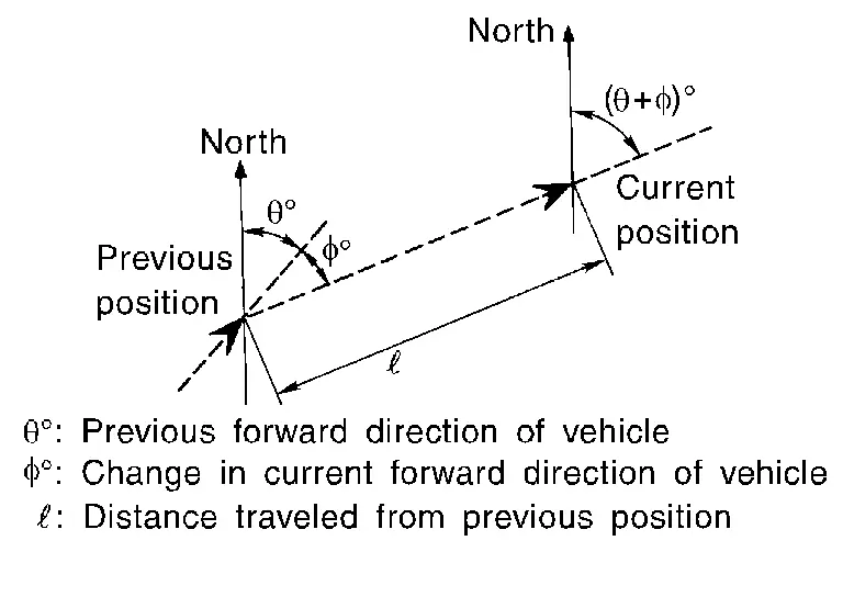 The current vehicle position will be calculated by detecting the distance the vehicle moved from the previous calculation point and its direction.