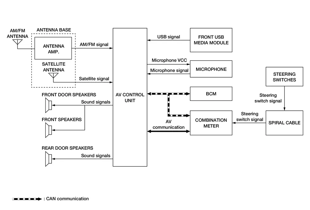 The AV control unit transmits the meter display signal as the audio status to the combination meter via CAN communication.