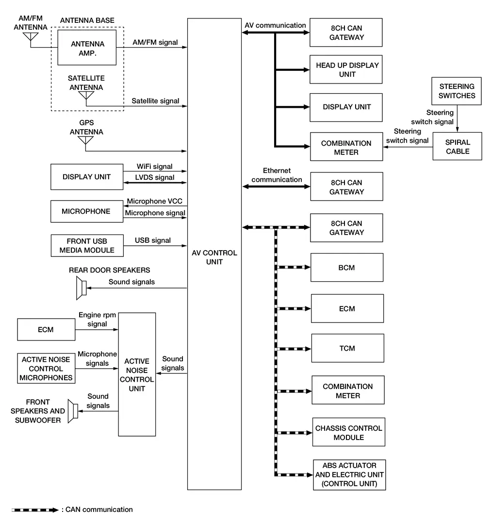 Satellite signals received by the antenna base (satellite antenna) are sent to the AV control unit. The AV control unit sends the audio signals to the rear door speakers and active noise control unit. The active noise control unit sends audio signals to the front speakers and front door speakers.