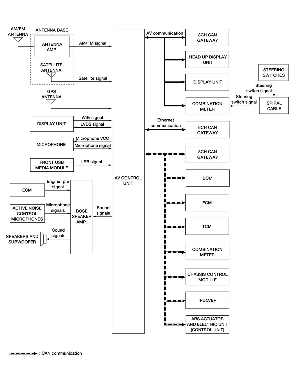 AM/FM signals received by the antenna base are amplified by the antenna amp. and sent to the AV control unit. The AV control unit sends the audio signals to the Bose speaker amp. The Bose speaker amp. then sends the audio signals to the speakers.