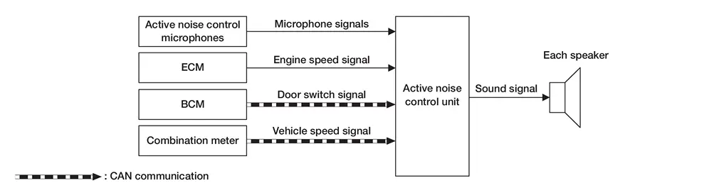 The active noise cancellation system outputs an reverse phase sound from the speakers to reduce engine noise.