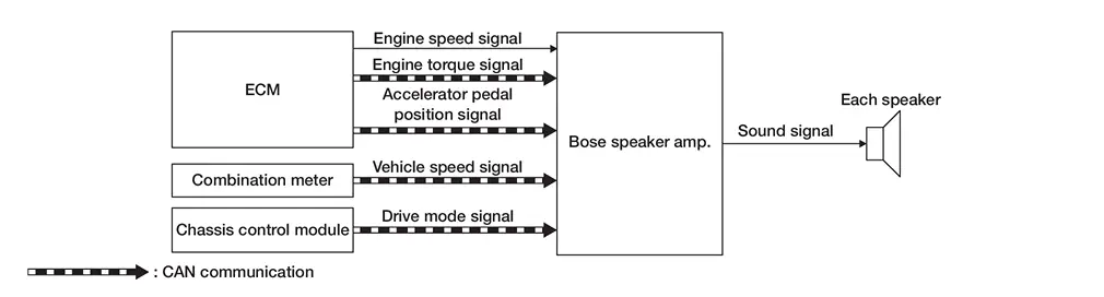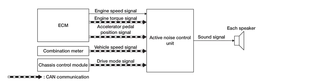 AV control unit determines the volume level according to the Nissan Ariya vehicle speed signal received from ABS actuator and electric unit (control unit), and transmits the sound signal to each speaker.