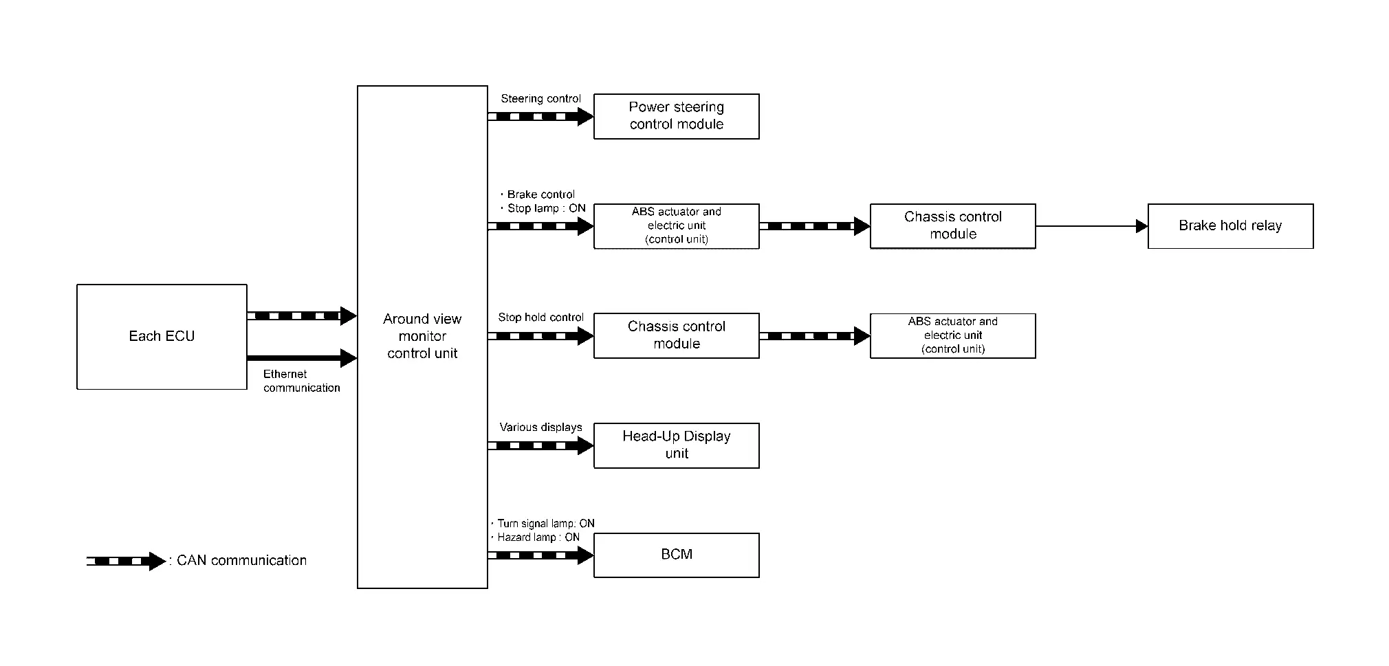 | Brake control | Chassis control module→ABS actuator and control unit (control unit)→ Electric control brake unit | Controls brake based on signal from around view monitor. |