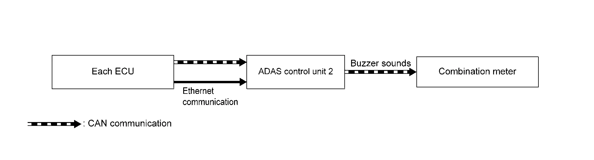 When buzzer (combination meter) system is normal, ADAS control unit 2 transmits buzzer sound request signal to combination meter and buzzer sounds the operation sound and warning sound required for ProPILOT Assist 2.1.