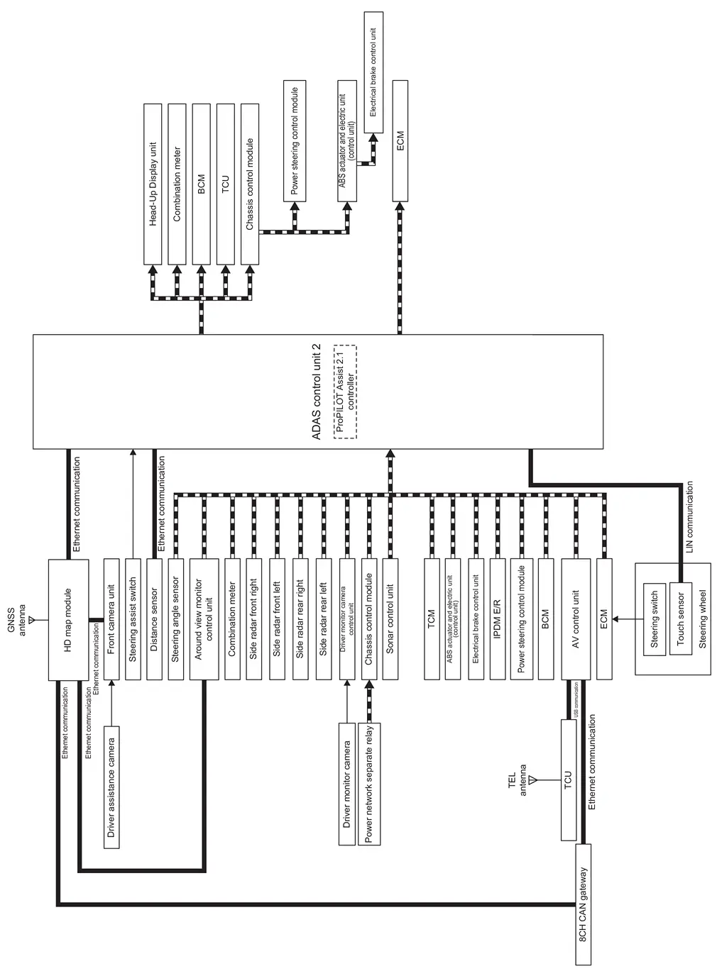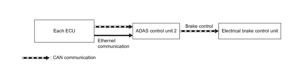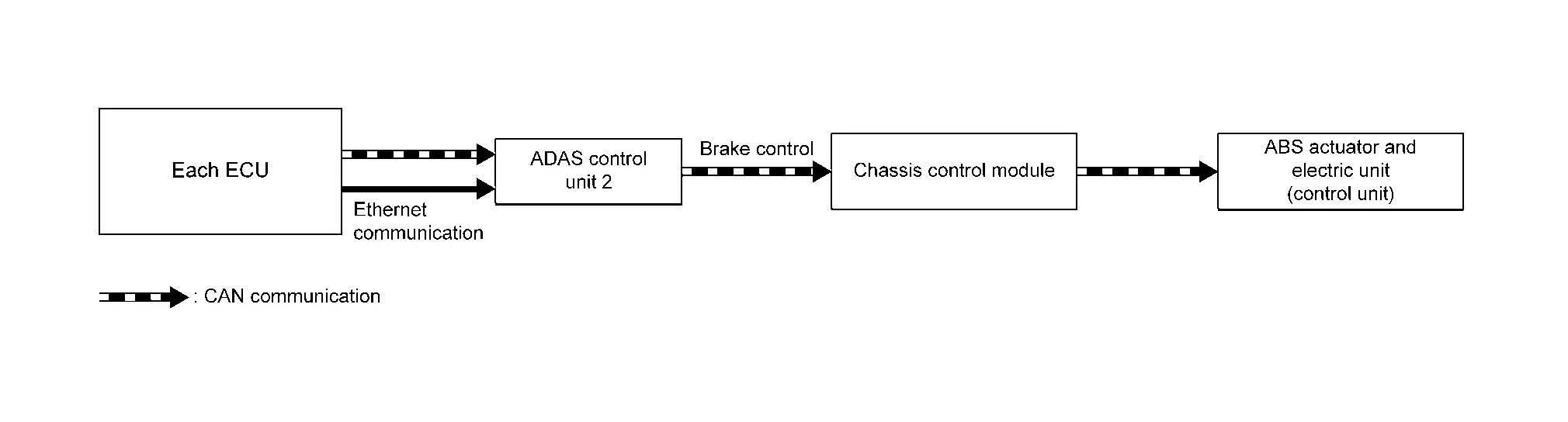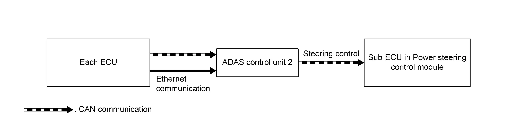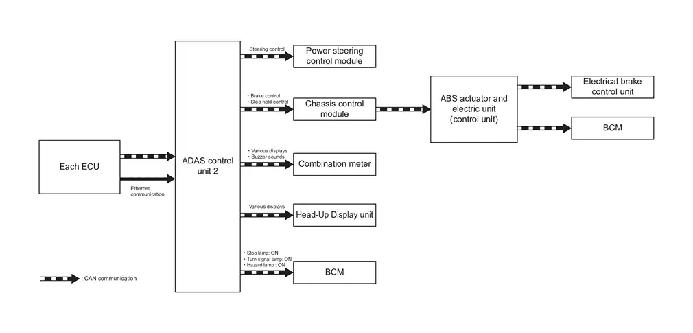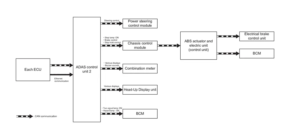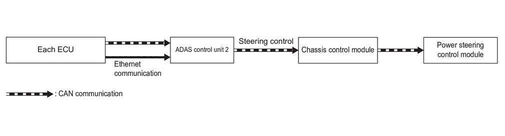| Steering control | Chassis control module→Power steering control module | Controls steering based on signal from ADAS control unit 2. |