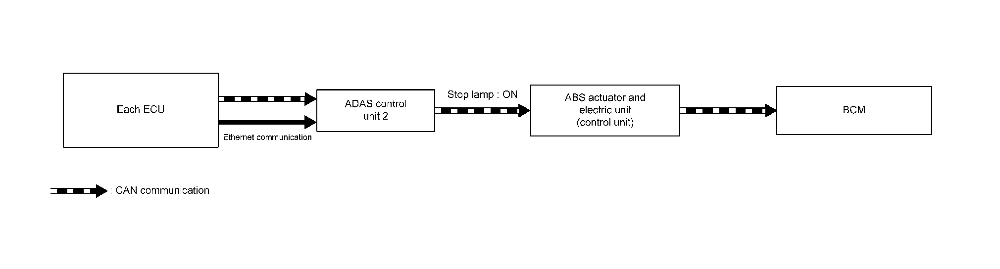 | Stop lamp ON | ABS actuator and control unit (control unit)→BCM | Turns on stop lamps based on signal from ADAS control unit 2. |