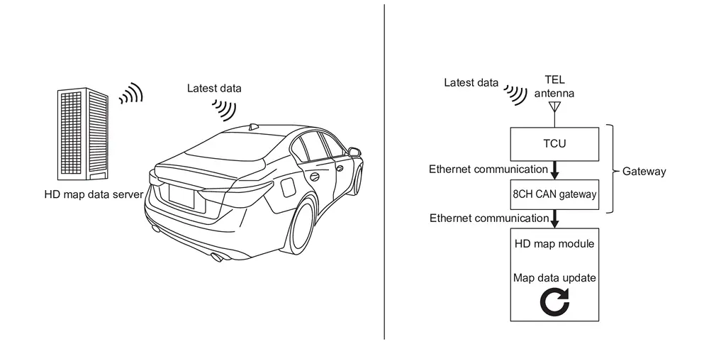 | HD map module | Ethernet communication | HD map data signal | Receives HD map data to grasp accurate road information | |