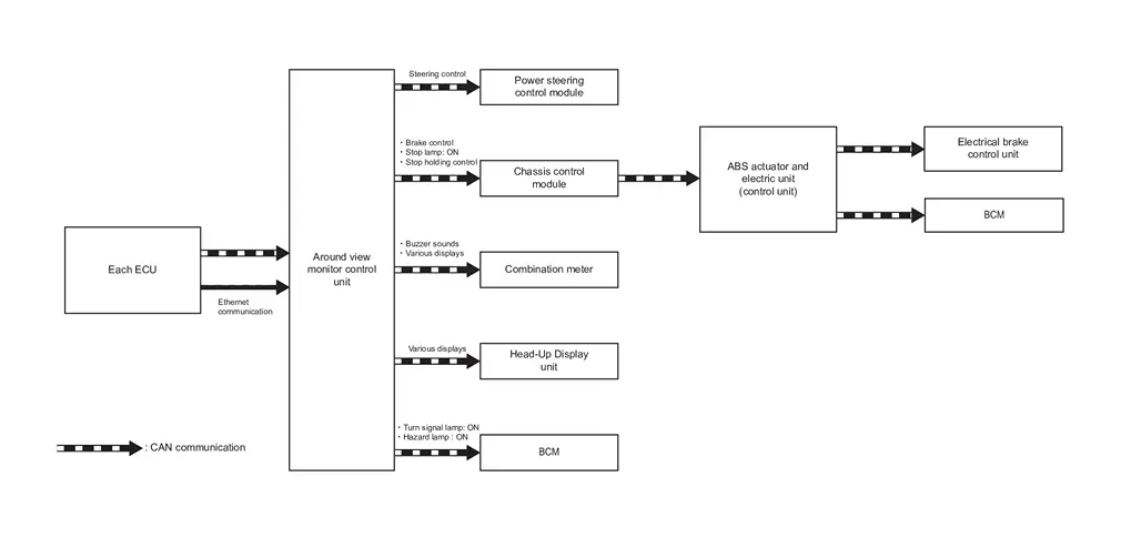| Stop lamp ON | Chassis control module→ABS actuator and control unit (control unit)→BCM | Turns ON stop lamp during deceleration based on signal from around view monitor. |