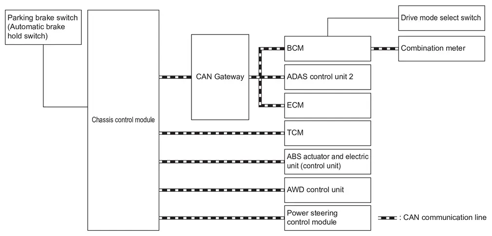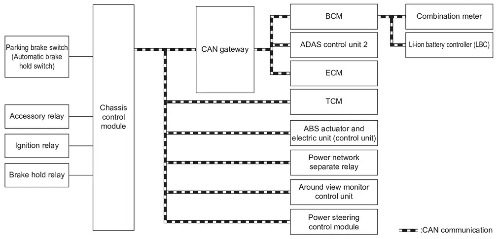 Chassis control module inputs the necessary information for control from CAN communication and each switch and integrally controls each system. Refer to the following table for systems controlled and input output signals.
