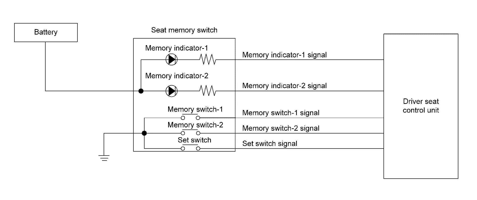 When memory switch 1 or 2 is pressed, it transmits memory switch 1 or 2 signal to driver seat control unit.