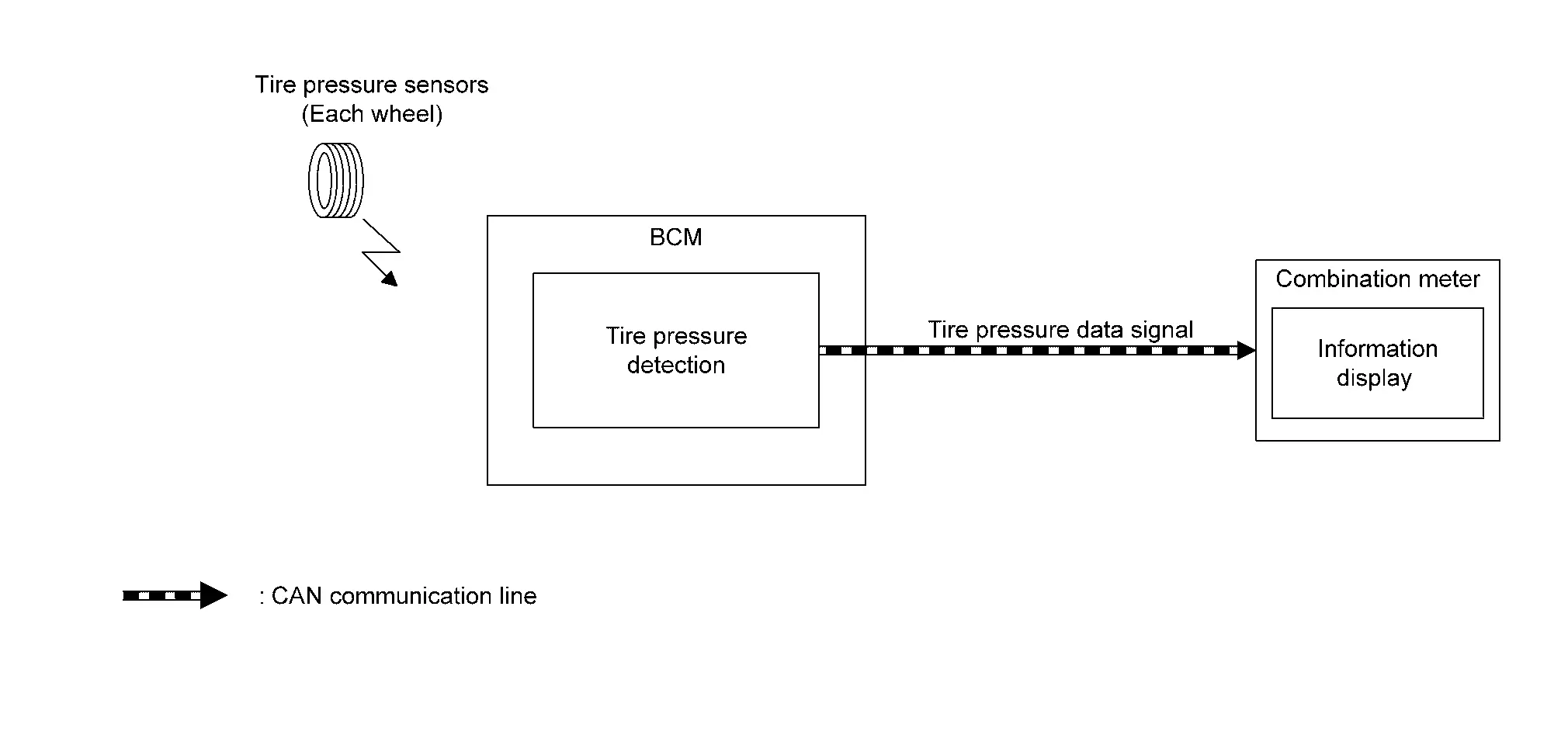 | Tire pressure data signal | BCM | Combination meter (CAN) | Transmits the tire pressure data signal to the combination meter via CAN communication. |