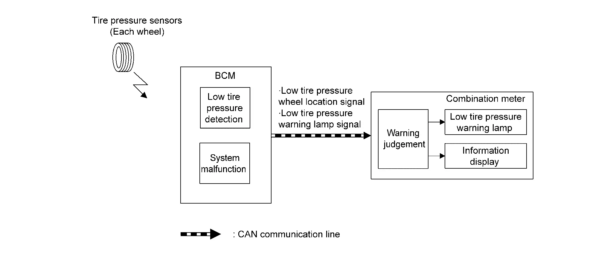 | Low tire pressure wheel location signal | BCM | Combination meter (CAN) | Transmits the low tire pressure wheel location signal to the combination meter via CAN communication. |