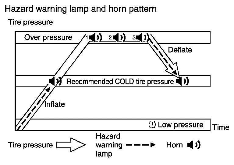 If the tire pressure value is equal to or greater than 4 psi (0.31 kg/cm2, 30 kPa) more than the recommended COLD tire pressure, the hazard warning lamps flash and horn sounds three times.