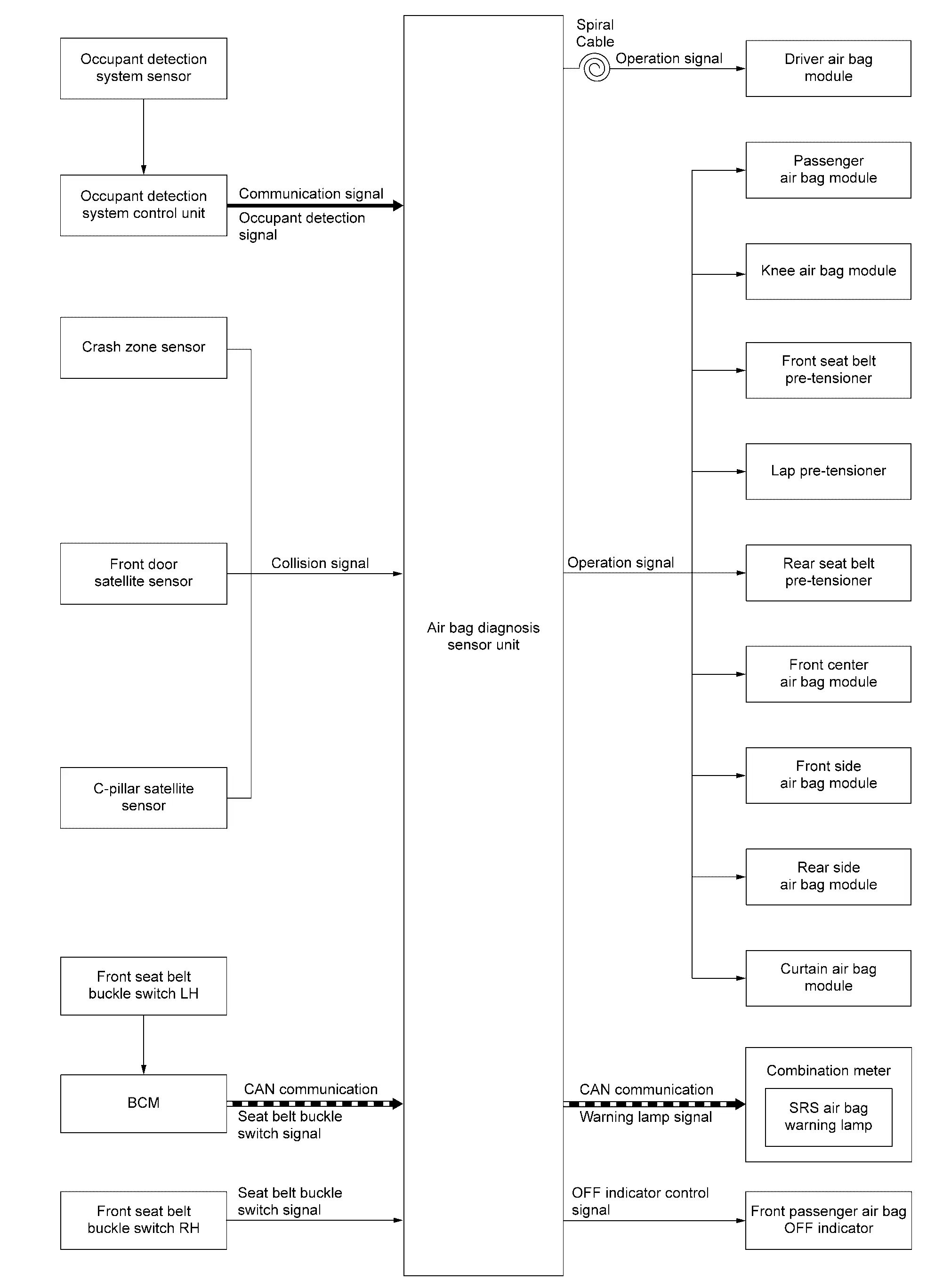 | BCM | BCM transmits the front seat belt buckle switch LH signal to air bag diagnosis sensor unit via CAN communication. | |
