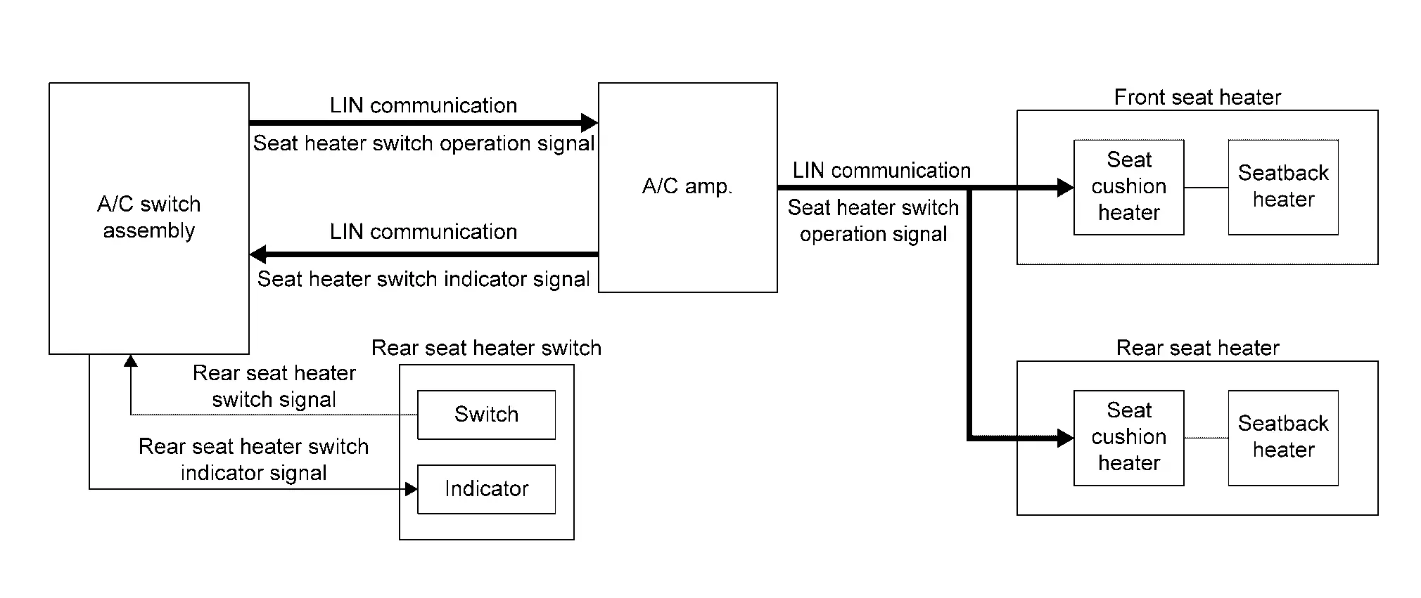 | A/C amp. | A/C amp. receives switch operation signals transmitted from the A/C switch assembly via LIN communication and transmits the switch operation signals to the seat heaters via LIN communication. |