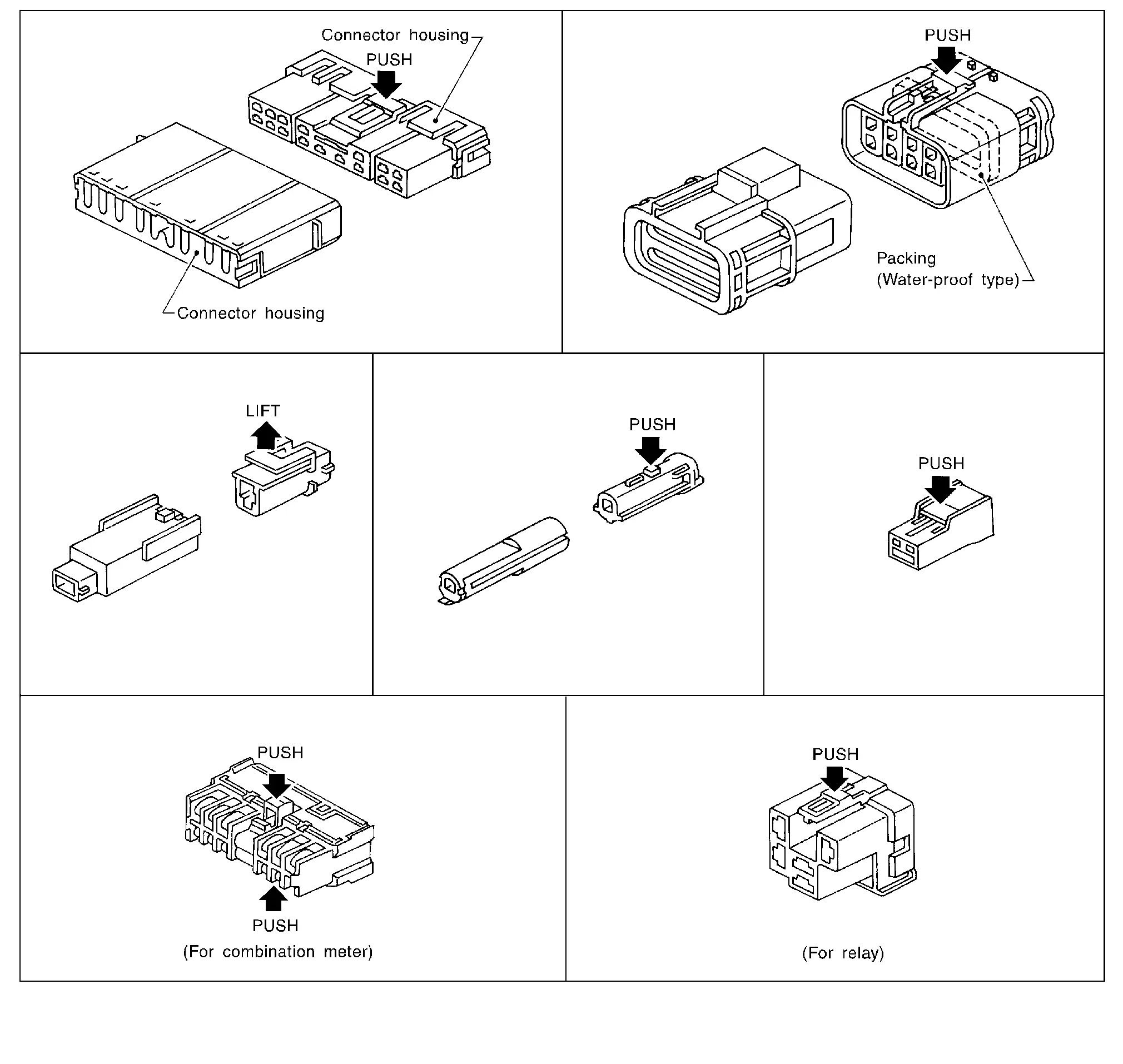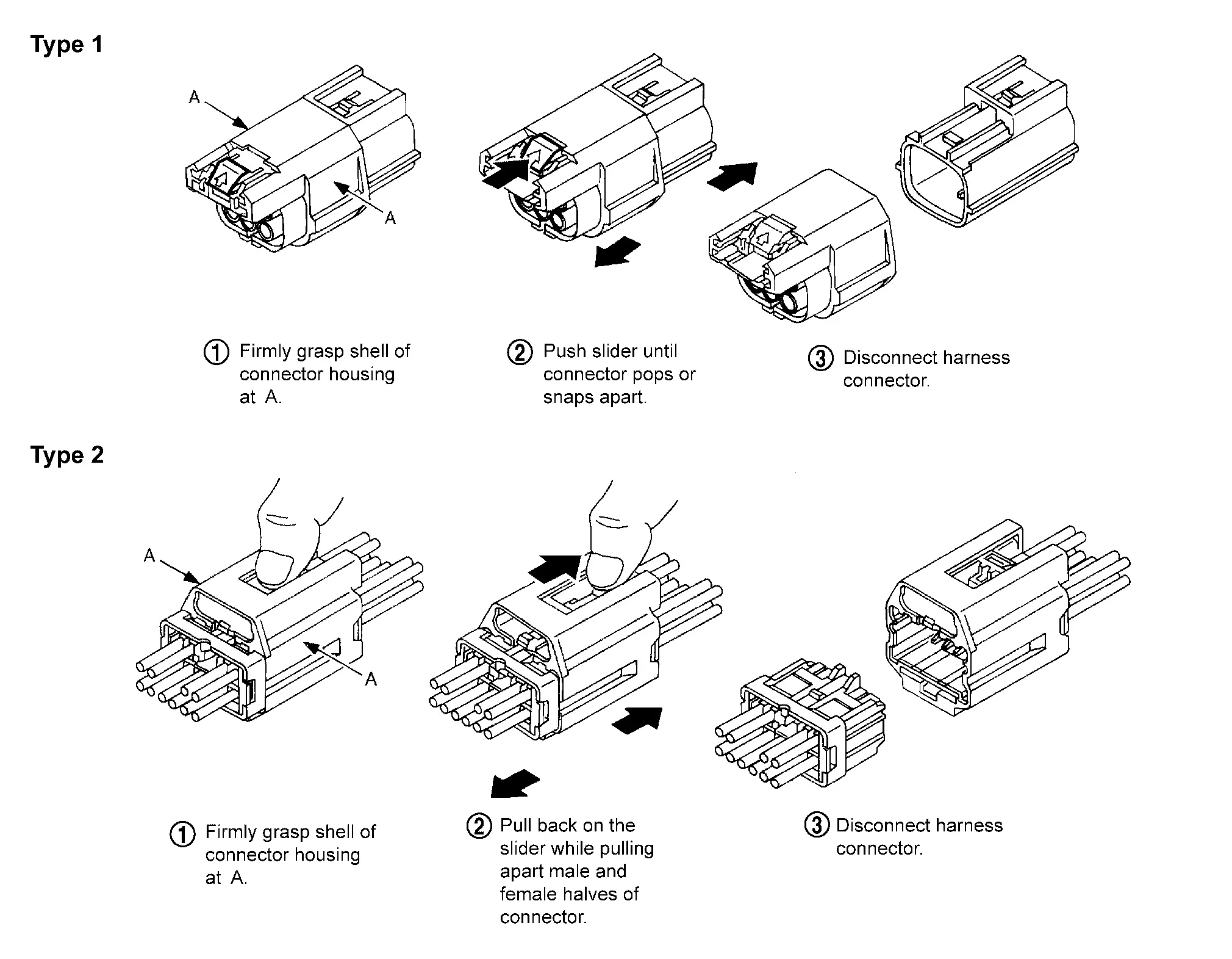 The tab-locking type connectors are disconnected by pushing or lifting the locking tab(s). Refer to the figure below.