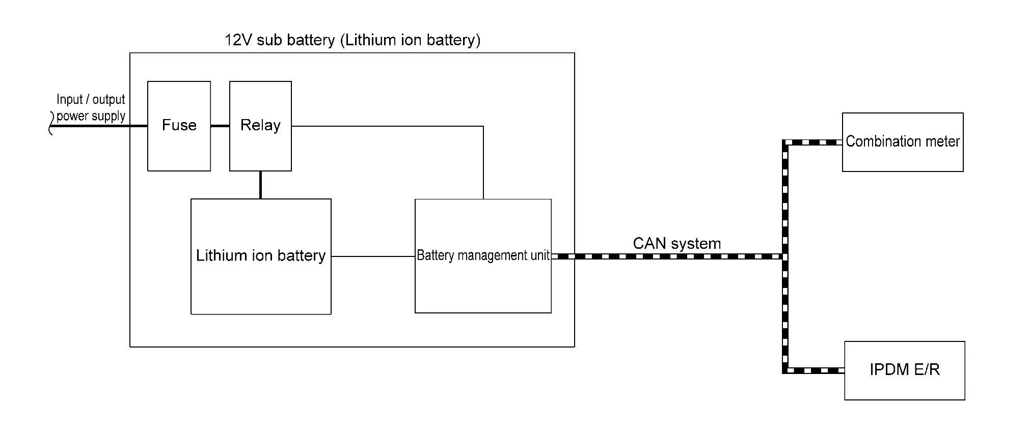 The 12V sub battery (lithium ion battery) communicates with the IPDM E/R by CAN communication and transmits the state of 12V sub battery (lithium ion battery), such as charged, discharged, its temperature and other state.