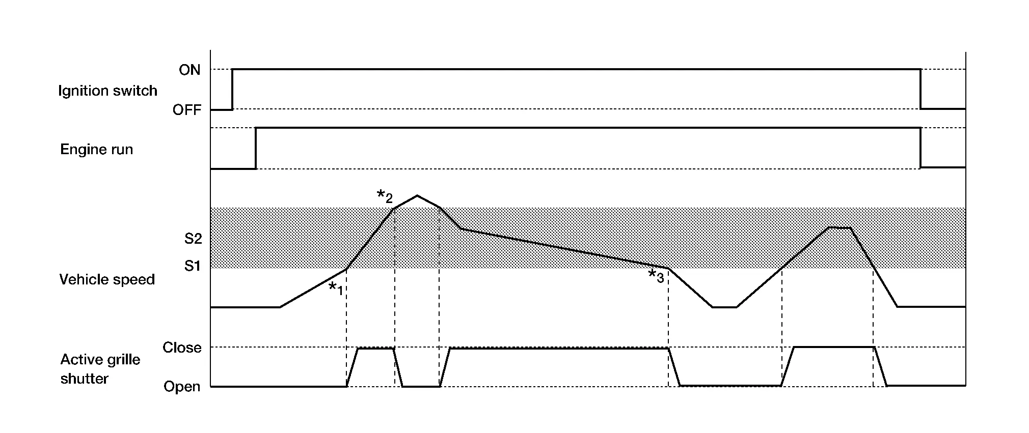 Active grille shutter is fully open when the vehicle stops or the ignition switch is turned OFF.