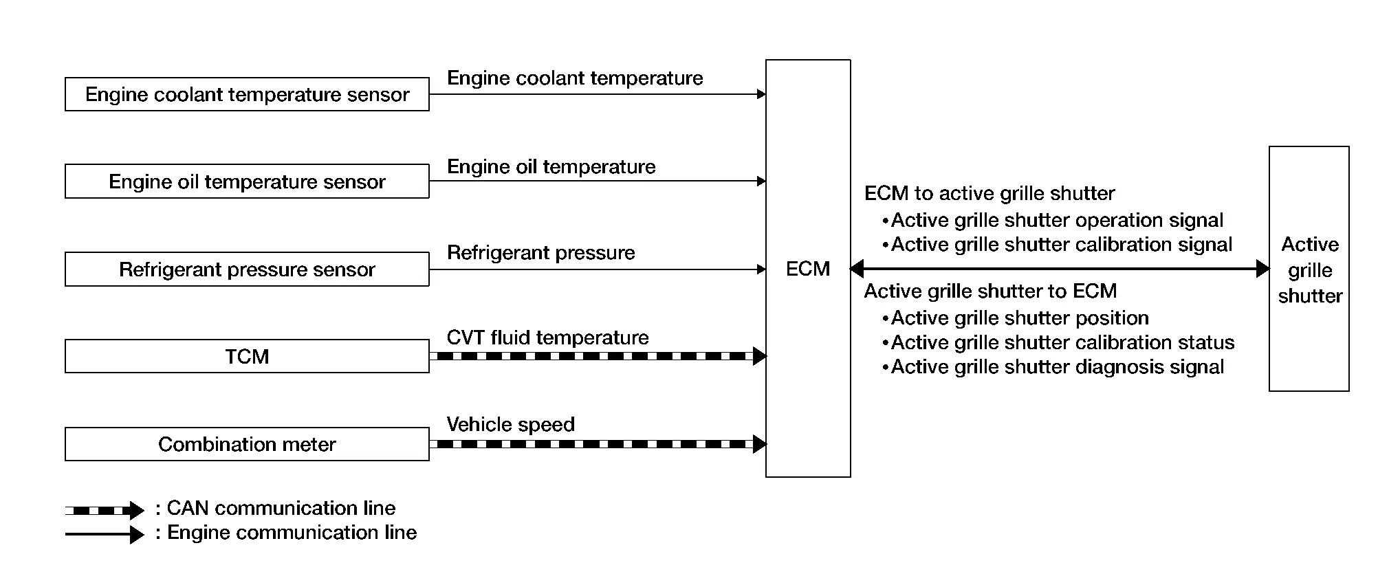Active grille shutter actuator is equipped with self-diagnosis function. When a malfunction is detected, a signal is transmitted to the ECM and the ECM records the active grille shutter malfunction.