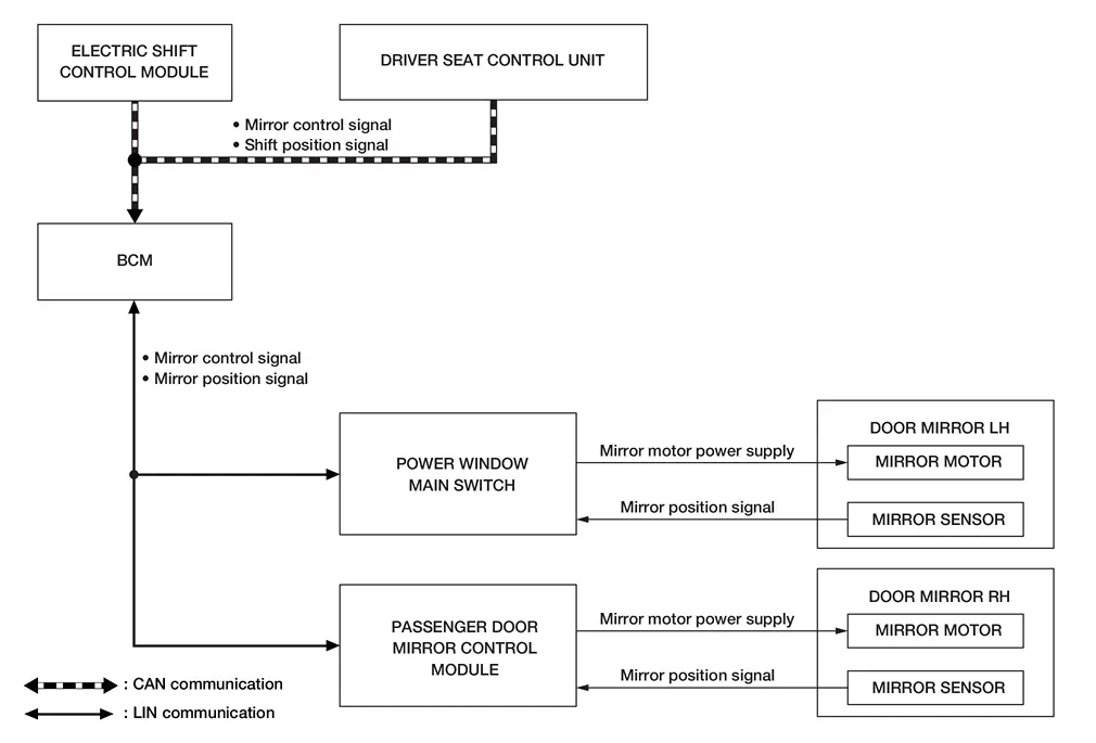 | Driver seat control unit | Transmits the mirror control signal to BCM via CAN communication. |