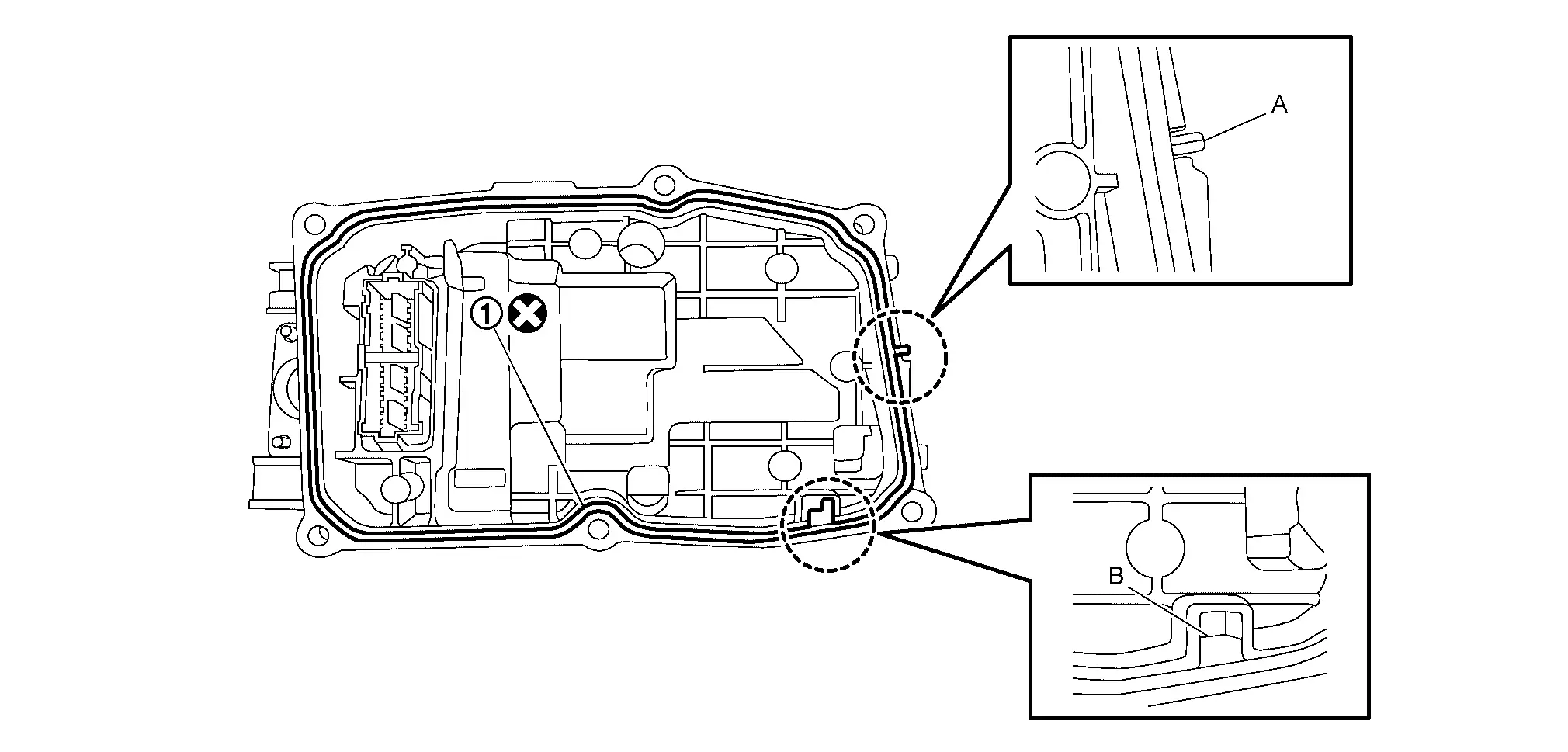 Two tabs (A and B) on TCM gasket need to be set to notches on TCM case.