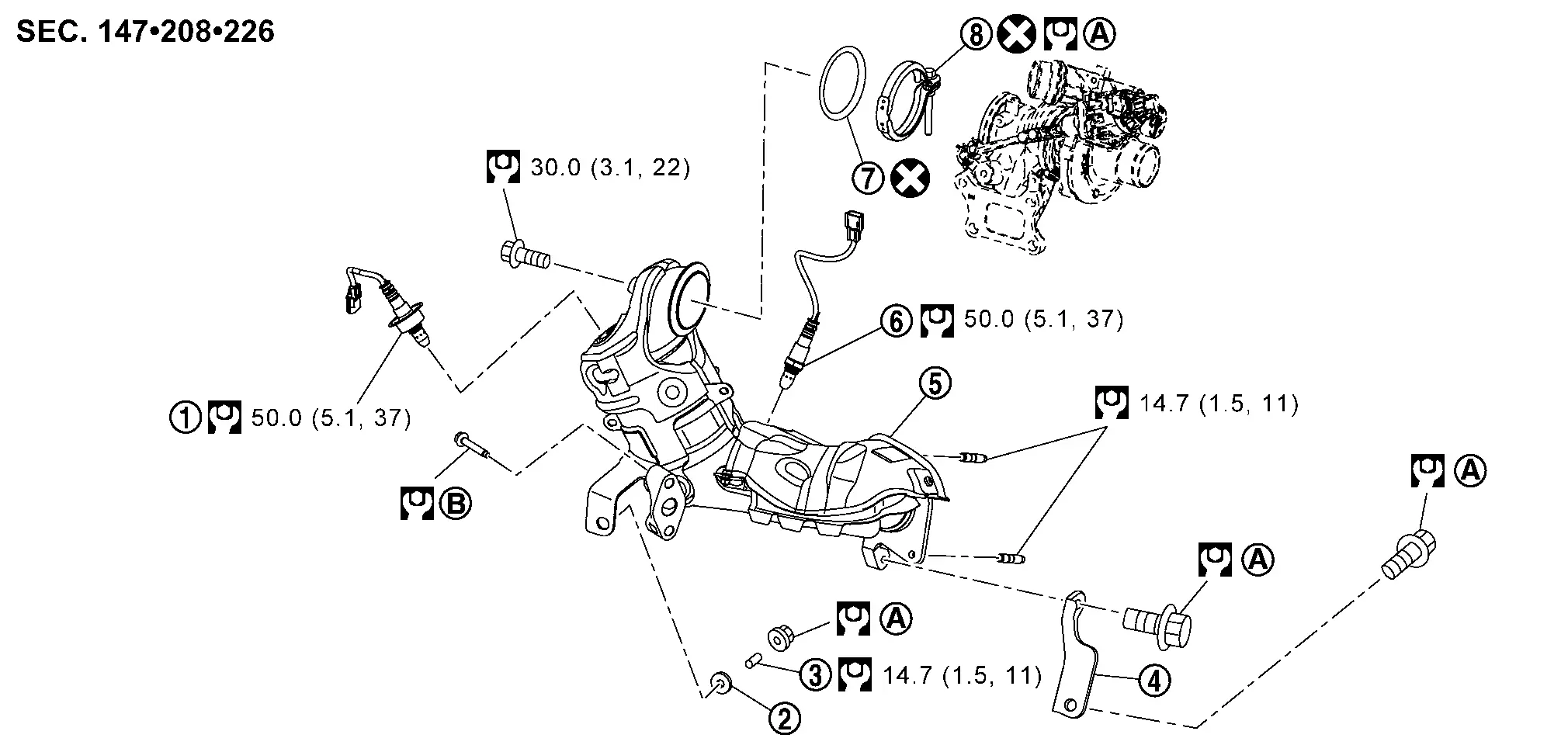 Do not over-tighten the air fuel ratio (A/F) sensor 1 and Heated oxygen sensor 2. Doing so may cause damage, resulting in a malfunction and the MIL coming on.