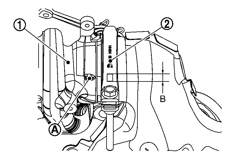 Locate mark (A) on turbo charger housing (1) must be in between paints (B) V-band clamp (2).