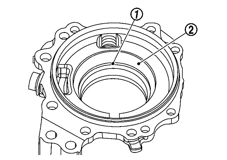 Remove ring gear bearing adjusting shim (transfer cover side) (1) and ring gear bearing outer race (transfer cover side) (2).