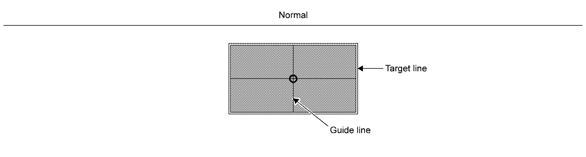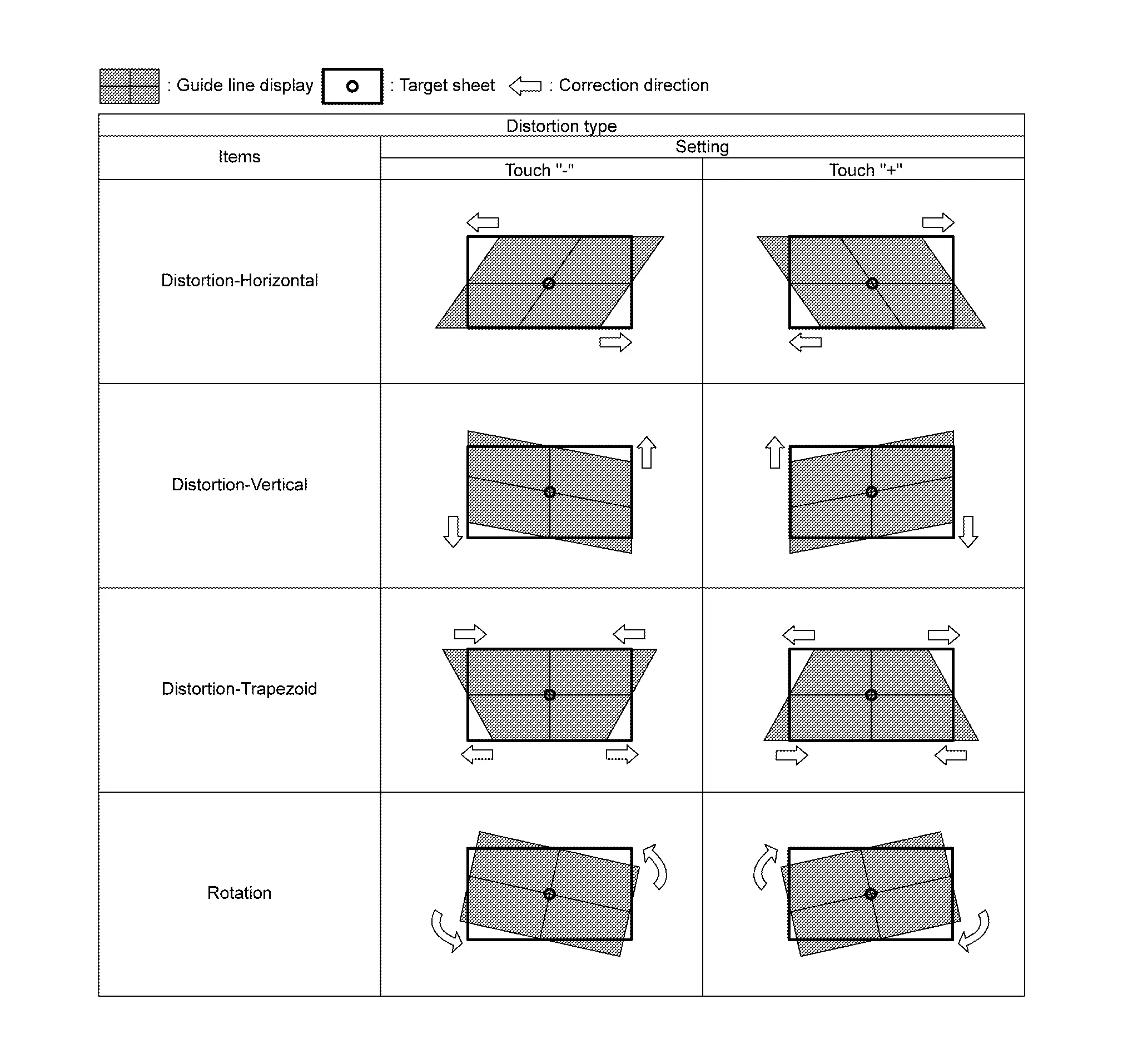 If the guideline display is distorted, touch "+" or "-" of the item corresponding to the distortion type to be corrected according to following table, and calibrate to match the target sheet.