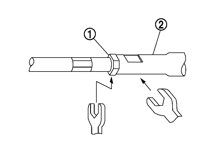 When tightening the lock nut (1), be sure to fix outer socket (2) with a wrench or an equivalent to prevent the ball joint from getting contact with the knuckle.