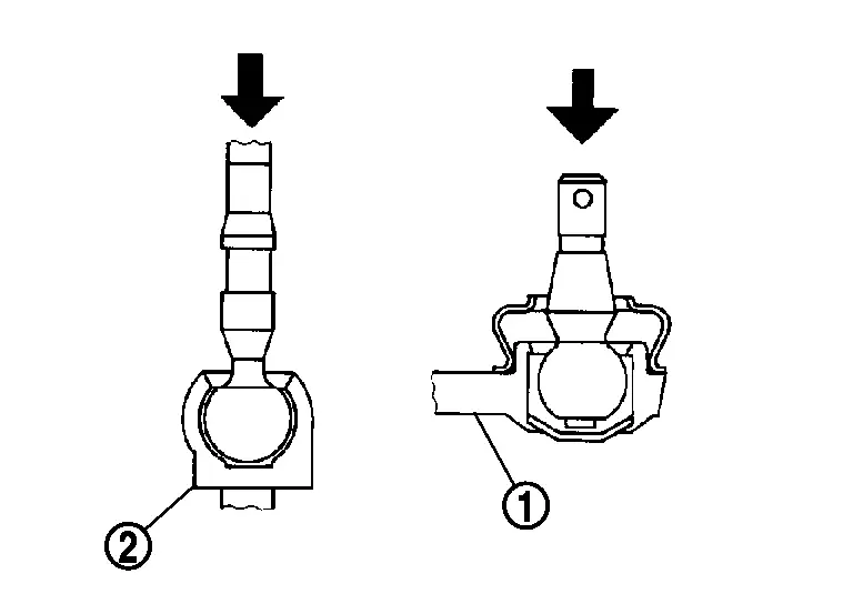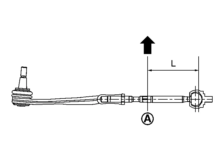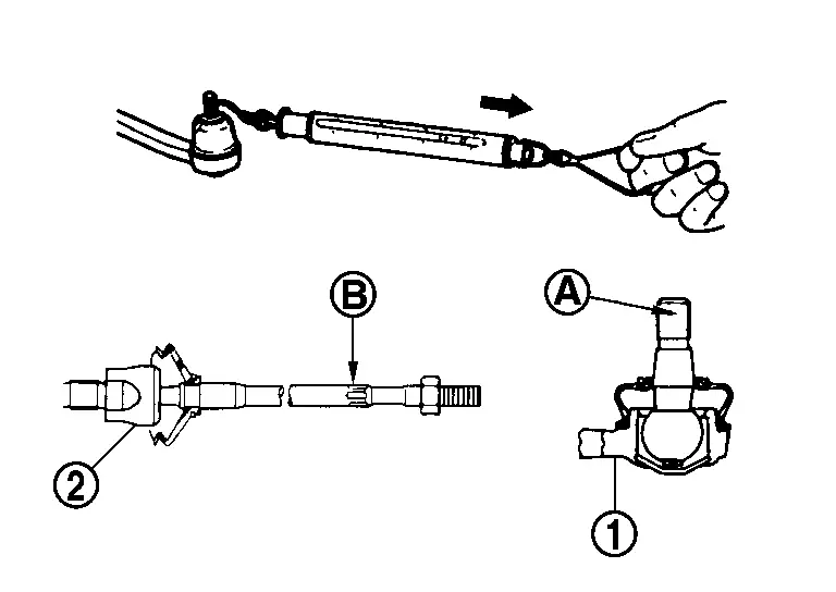 Measuring point of outer socket (1) Ball stud upper side (A) Measuring point of inner socket (2) Point (B) shown in the figure Swinging force : Refer to Steering Gear and Linkage.