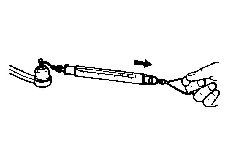 Hook a pull gauge [SST: — (NI-44372)] at the point shown in the figure and pull the pull gauge. Make sure that the pull gauge reads the specified value when ball stud and inner socket start to move. Replace outer socket and inner socket if they are outside the standard.
