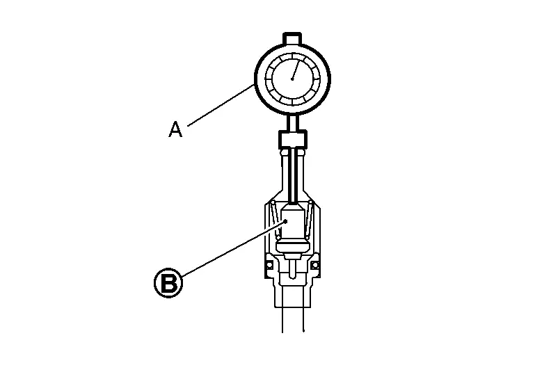 When coolant is cold, place dial gauge (A) on the pellet (B) of water control valve. And then measure elongation (M1) between the inlet of tube and the top of pellet.