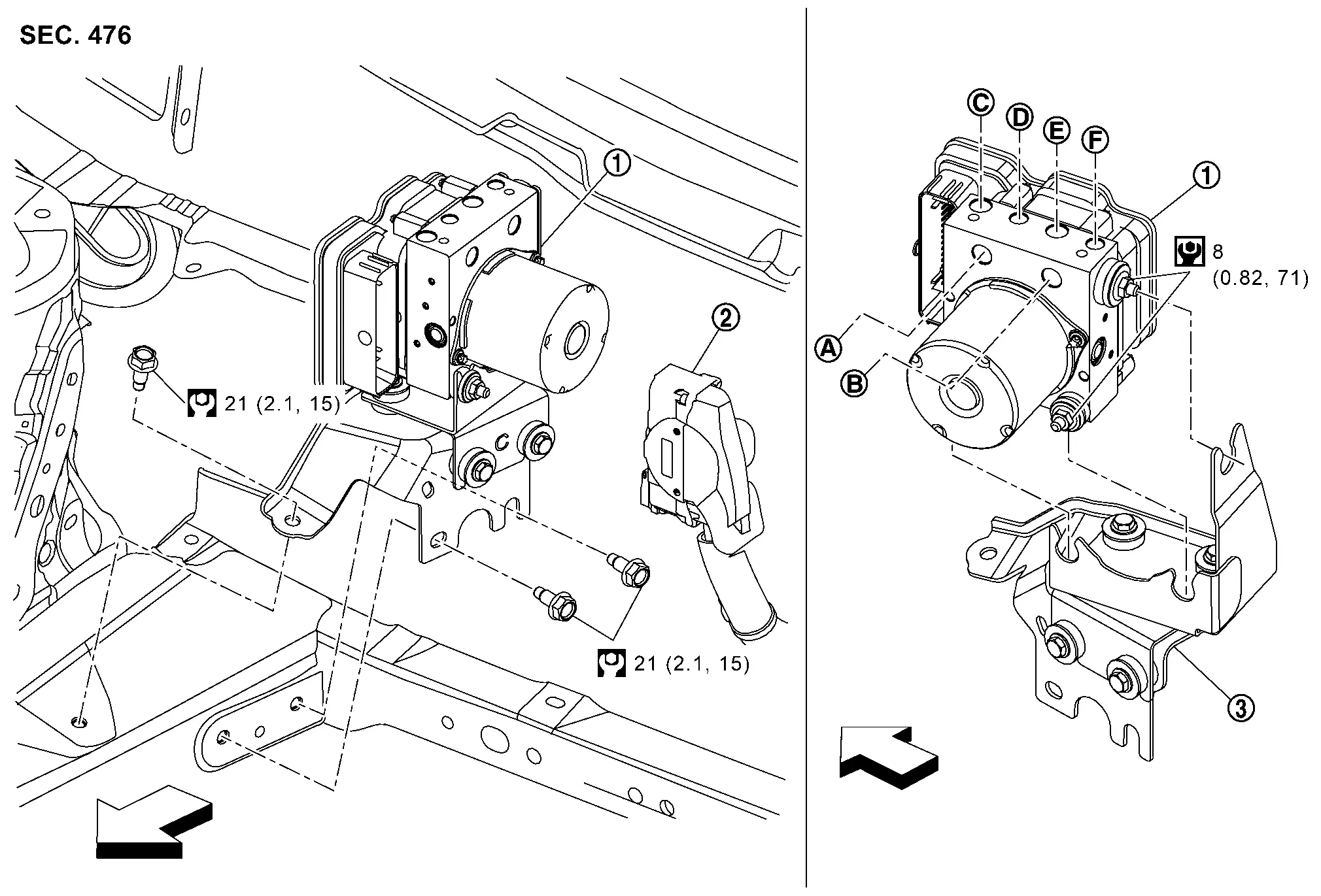 Remove the bolt at the ABS actuator and electric unit (control unit) bracket upper side, then remove the ABS actuator and electric unit as a set with bracket.