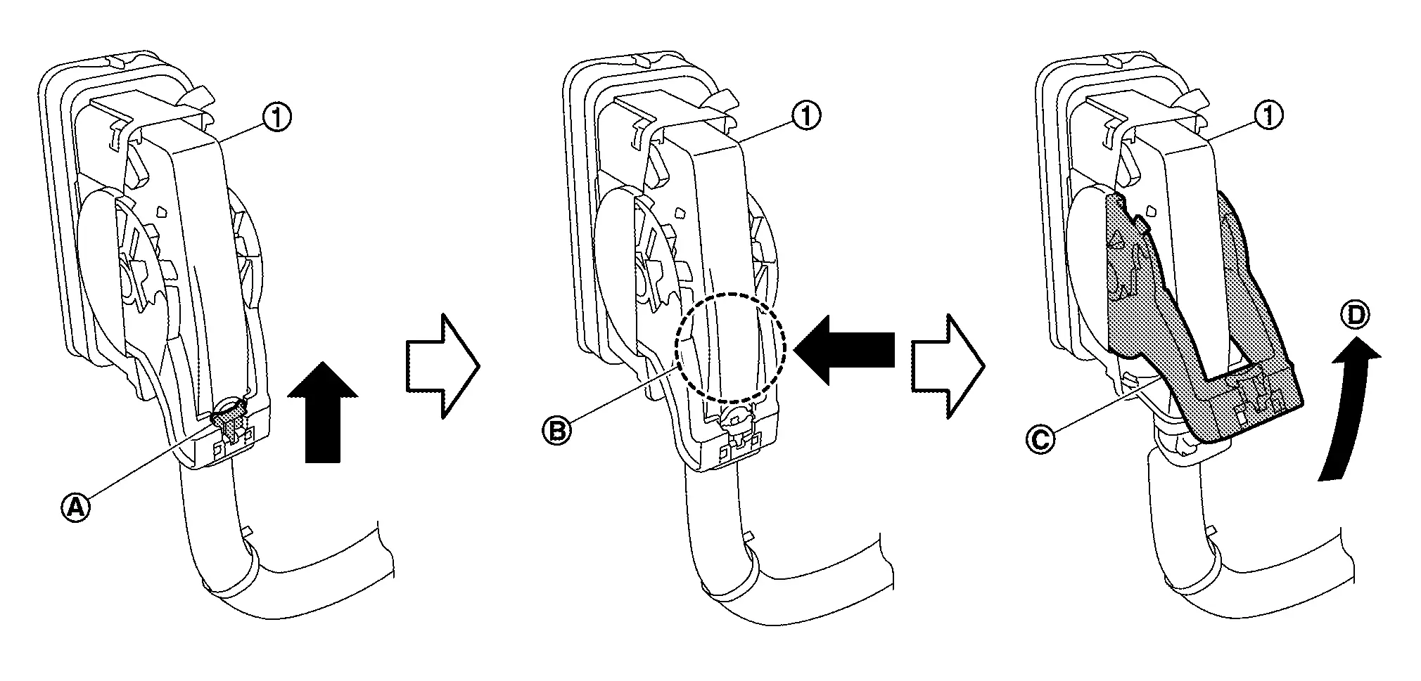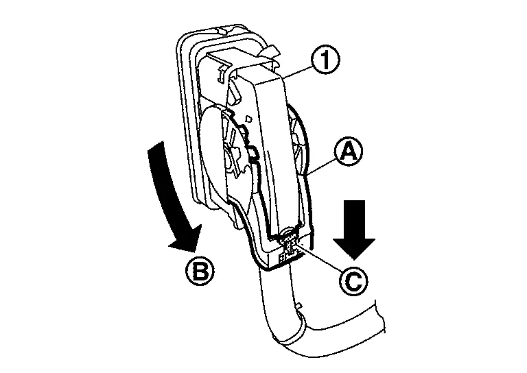 After installing the ABS actuator and electric unit (control unit) harness connector (1), move the lever (A) in the direction (B) and down the pawl (C) to secure the locking.